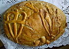 Chlebek upiekł się bardzo ładnie. Znakomicie wyrósł podczas "gotowania", chociaż miał na sobie niewielki ciężar. Zrobiłam eksperyment, ponieważ potrzebowałam chleb z ozdobami na uroczystości firmowe, położyłam na bochenek dekoracje, co go trochę obciażyło. Po odkryciu, w czasie pieczenia troszkę opadł, ale i tak wyglądał i smakował jak trzeba. Następnym razem upiekę normalny chlebek, tylko pokombinuję z mąkami. A oto efekt: