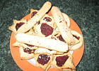 Można też spróbować wywałkować niewielkie prostokąty, wzdłuż dłuższego końca nakładać marmoladę, sklejać brzegi i toczyć rurki.