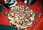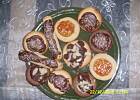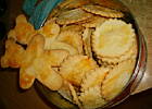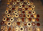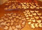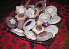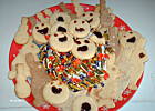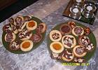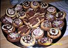 Lub wycinać kółka szklanką, na środku wykrawać dziurki. Nakładać krążek z dziurką na pełne kółeczko, a wgłębienie wypełniać marmoladą lub powidłami.