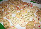 Ciasteczka układać na blasze wyłożonej papierem do pieczenia i piec w 180 stopniach przez 10-15 minut do lekkiego zrumienienia. Dekorować pokrojonymi bakaliami, posiekanymi orzechami, płatkami migdałowymi, rozpuszczoną czekoladą i kolorową posypką.