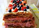 Alman, wychodzi z jednego ciasta francuskiego, podzielonego jeden kawałek ciasta. ja pokroiłam je na 3 części jeszcze przed pieczeniem, żeby było łatwiej. Pierwszy blat posmarowałam dżemem z czarnej porzeczki (taki miałam). Na to masa śmietankowa ze zblendowanymi mrożonymi malinami. Pokryłam drugim blatem ciasta. Nasmarowałam znów dżemem, na to ponownie masa i 3 blat. Posmarowałam go wcześniej odstawioną masą śmietankową i na to owoce. Boki oczywiście posmarowałam masą i posypałam uprażonymi płatkami migdałowymi. Po kilku godzinach leżakowania w lodówce mała degustacja. Jednym słowem -pychota. Dzięki Nadia za kolejny świetny przepis chef