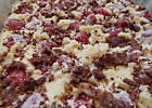 Ciasto wykładamy do dużej formy. Układamy owoce. Jeśli mają nadmiar soku (truskawka, rabarbar, najpierw obtaczamy w budyniu lub suchej galaretce) i dopiero wówczas wykładamy na ciasto.