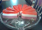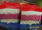 Galaretkę rozpuścić w jednej szklance wody. Ubić śmietanę, dodać cukier puder do smaku, dalej ubijając, wlewać powoli tężejącą galaretkę cytrynową. Ubitą śmietanę wylać na masę truskawkową i odłożyć do stężenia do lodówki. Wierzch zalać dwiema galaretkami truskawkowymi rozpuszczonymi według przepisu na opakowaniu. Ciasto dobrze schłodzić w lodówce. W sezonie możemy na wierzch pod galaretkę poukładać świeże truskawki.