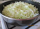 Małą główkę kapusty poszatkować i wrzucić na głęboką patelnię z pełną lyżką masła. Po chwili ona " siądzie " i dodać przesmażoną cebulkę. Po chwili - czyli na koniec - g a r ś ć mojego ulubionego koperku. Jest mięciutka ! Ani kropli wody, ani kropli octu - troche soli, troche cukru, szczypta pieprzu.