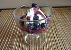 Borówki opłukać, osuszyć. Odłożyć kilka do dekoracji, pozostałe zmiksować blenderem z jogurtem i cukrem. Wlać na dno naczynia uzyskany mus. Na środku ułożyć 1 lub 2 gałki lodów waniliowo- śmietankowych, dookoła rozsypać pozostałe borówki i ozdobić listkiem mięty.