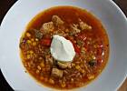 Zawartość patelni przełożyć do garnka, wlać bulion. Oczyszczoną paprykę pokroić w paski - wrzucić do bulionu, dodać także osączoną kukurydzę i ryż. Gotujemy do miękkości/ugotowania się wszystkich składników.
