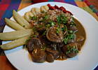 Gulasz jest wyśmienity,smakuje z chlebem,kaszą i ziemniakami,polecam:)