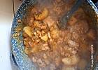 Po tym czasie wlewamy na patelnię pół szklanki wody. Mieszamy. Będzie ciężko, ale to normalne. Dodajemy szklankę wody i ponownie mieszamy. Zrobi się nam potwornie gęsty sos i tak ma być. Mięso zalewamy wodą stopniowo po to, by nie zrobiły się kluski z mąki. Teraz zalewamy mięso wodą tak, by mogło pływać.
