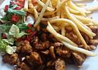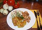 Uwielbiam takie obiadki!!!Pycha!Nie wiem jak takie danie smakuje w knajpie,ale to jest wyśmienite,proste i szybko się robi.Zamiast frytek ugotowałam ryż,a potem go podsmażyłam z dodatkiem słodkiej papryki.Do tego suróweczka z pora,jabłek i marchewki......mniam