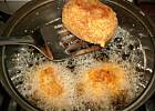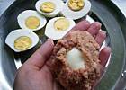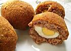 Ugotować na twardo 8 jajek, obrać i ostudzić. Mięso mielone zagnieść z 1 surowym jajkiem, posiekaną cebulą i 3 łyżkami tartej bułki. Przyprawić do smaku solą, pieprzem i musztardą. Masą mięsną cienko okleić ugotowane jajka. Panierować je kolejno w mące, rozmąconym jajku, a na koniec w tartej bułce. W rondlu rozgrzać tłuszcz do głębokiego smażenia. Wkładać jajka, smażyć po 6-8 minut na brązowy kolor. Osaczyć z tłuszczu na papierowym ręczniku. Ostudzić. Zrobić sałatkę: seler obrać i zetrzeć na grubej tarce. Pory pokroić w cienkie krążki, jabłko na małe kawałki. Ocet przyprawić do smaku solą i pieprzem, utrzeć z olejem. Sosem polać składniki sałatki, wymieszać. Półmisek wyłożyć listkami sałaty, na wierzchu ułożyć szkockie jajka i sałatkę z selera. Udekorować listkami natki.