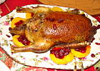 Żurawinę zalać 100 ml wody wymieszanej z winem i wódką. Pozostawić na kilka godzin. Sprawioną kaczkę umyć, osuszyć papierowym ręcznikiem. Natrzeć solą i pieprzem. Wnętrze kaczki posolić, popieprzyć i oprószyć majerankiem i tymiankiem. Odstawić na 2 godziny. Po tym czasie w rondelku stopić smalec i lekko go wystudzić. Kaczkę cieniutko posmarować stopionym smalcem. Przełożyć do wysmarowanego tłuszczem żaroodpornego naczynia. Wstawić do nagrzanego do 200 stopni C piekarnika i piec od 1 ½ do 2 godzin. W czasie pieczenia co pół godziny podlewać kaczkę wytopionym tłuszczem. Gdy kaczka miękka wyjąć ją z naczynia w którym się piekła i odstawić w ciepłe miejsce. W rondlu rozgrzać masło, zeszklić na nim pokrojoną w drobną kosteczkę cebulę. Dodać żurawinę wraz z zalewą w której się moczyła. Gotować na małym ogniu do redukcji płynu o połowę. Dodać tłuszcz wytopiony z kaczki. Zagotować. Zagęścić mączką ziemniaczaną rozprowadzoną w niewielkiej ilości wody (opcjonalnie). Kaczkę podzielić na porcje polać gorącym sosem. Podawać z pyzami drożdżowymi (pampuchami) lub pieczonymi ziemniakami, z dodatkiem czerwonej gotowanej kapusty lub zestawem dowolnych surówek.