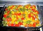 Na patelnie wrzucamy pokrojone w kostkę (taka sama jak ananasy) papryki i zalewamy sokiem ananasowym z puszki.