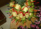 Na wykałaczki nadziewamy( nakłuwamy) po jednym plasterku cienkiej kiełbaski, następnie po pół plasterka świeżego zielonego ogórka( ogórka nie obieramy ze skórki), po ogórku nadziewamy kawałek pomidora. Pasek sera żółtego zawijamy na kształt okręgu i nadziewamy go na wykałaczkę.