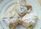 Po tym czasie ciasto rozwałkować na grubość nie większą niż 0,5 cm. Ciasto pokroić na kwadraty o boku. ok. 5 cm. Na każdym kłaść łyżeczkę nadzienia, zlepiać przeciwległe rogi, tworząc kopertę. Ciastka ułożyć na blasze wyłożonej papierem do pieczenia. Wstawić do nagrzanego piekarnika. Piec na złoty kolor, ok. 25-30 minut w 200 stopniach.