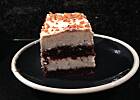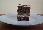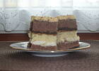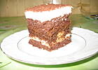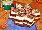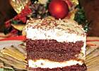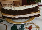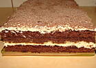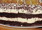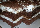 Na spód blachy ciemne ciasto, potem 1/2 bitej śmietany. Jasny biszkopt kładziemy na śmietanę i polewamy na całości płynną masą czekoladowo-alkoholową (aby biszkopt "pił" masę radzę zdjąć przyrumienioną skórkę, a wtedy będzie pochłaniał jak gąbka. albo też lekko tę warstwę przypieczoną nakroić w gęstą kratkę ostrym nożem). Na polany biszkopt układamy ciemny biszkopt ( bez obawy, przylepi sie spokojnie do tego naponczowanego) i smarujemy pozostałą śmietaną. Wierzch dekorować w/g upodobania, w moim przypadku jest to starta czekolada. Wstawić do lodówki w celu schłodzenia.