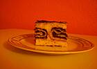 Do ciepłego budyniu dodawać po kawałku margaryny,rozbić mikserem.Masę podzielić na pół,smarować ciepłą masą.Na posmarowany blat położyć roladki i resztę masy.Przykryć drugim blatem,polać polewą.