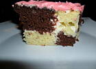 Żółtka utrzeć z cukrem,dodać wodę,oliwę i mąkę wymieszaną z proszkiem do pieczenia;na koniec dodać ubitą pianę z białek.Ciasto podzielić na dwie części;do jednej dodać 2 łyżki kakao,drugą pozostawić białą.Ciasto piec w dwóch podłużnych,półokrągłych foremkach.Po upieczeniu,pokroić w 2cm.kawałki,smarować kremem i składać na przemian (jeden jasny,jeden ciemny kawałek).Na wierzchu ciasto polać polewą czekoladową i posypać wiórkami kokosowymi.