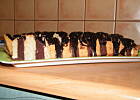 Wystudzone ciasto pokroić na kromki jak chleb. Przekładać masą na przemian kromka jasna, kromka ciemna układając na czymś długim (ja mam specjalnie do tego zrobioną deseczkę).