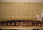 Wiem, że niektórzy kroją to ciasto ukośnie. Można oczywiście i tak. Ja całego metrowca przekrawam wzdłuż na pół i nakładam kawałki zawierające jasne i ciemne ciacho przełożone masą. Może nie jest to tak efektowne, ale bezpieczniejsze:)