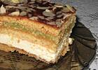 Gotowe ciasto oblać polewą czekoladową, posypać płatkami migdałowymi