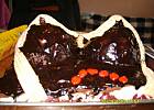 masło utrzeć z cukrem i cukrem waniliowym, a następnie z żółtkami i schłodzoną płynną czekoladą 4 kostki odłożyć. wymieszać ze zmielonymi migdałami, mąką pszenną i ziemniaczaną, bułką tartą, proszkiem do pieczenia i pianą z białek. przełożyć do formy piec 45 minut w temperaurze 180 stopni. odstawić na 3 godziny, przekroić na 3 krążki nasączyć wiśniówką. przełożyć wiśniami i kremówką ubita z cukrem pudrem i rozpuszczoną żelatyną. udekorować bitą śmietaną zwiórkowaną czekoladą i wiśniami