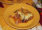 4. W naczyniu żaroodpornym układamy warstwami plasterki bakłażana i mięso – na górze powinien się znaleźć bakłażan. Zalewamy całość sosem, posypujemy serem