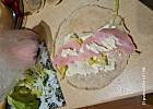 Naleśniki posmarować sosem czosnkowym, wysypać troche sałaty lodowej, położyć plasterek szynki.