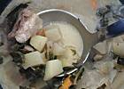 Posiekać por na półplasterki. Umyć liście kalarepki i pozbawić środkowego, grubego "nerwu". Posiekać w cienkie paseczki. Dorzucić do warzyw i mięsa razem z ząbkiem czosnku. Gotować ok. 10 minut, aż liście zmiękną. Posypać ziołami (ilość i rodzaj wg uznania).