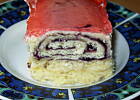 Przyznam, że ciasto było dla mnie niemałym wyzwaniem ;) Użyłam tylko brzoskwiń i czerwonej galaretki, a w rolady włożyłam twardą marmoladę, bo bałam się, że mi dżem wypłynie. Na wierzchu ułożyłam okrągłe biszkopty i polałam czekoladą. Pięknie się prezentuje na stole i świetnie smakuje