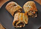Ciasto po wyrośnięciu jeszcze raz zagnieść. Wyłożyć na posypaną mąką stolnicę i rozwałkować na ok. 1 cm. Pokroić na pasy 30x10 cm i na środek każdego nałożyć farsz.
