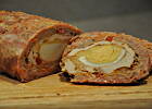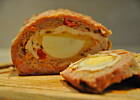 Formę keksówkę małą (długość 20cm) wysmarować tłuszczem, wyłożyć do niej 1 część mięsa. Następnie wzdłuż ułożyć połówki ugotowanych jajek ( w mojej zmieściły się 3 (1,5 jaja). Jajka przykryć drugą częścią mięsa, ułożyć na to pokrojoną w kostkę paprykę, potem przyprawionego fileta z kurczaka i na końcu 3 część mięsa mielonego.