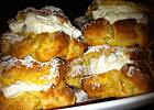 Wystygniete i zimne spody ptysiowe smarujemy ubita smietana z jogurtem i dodajemy owoce,przykrywamy ptysiowa gora.Posypujemy pudrem cukrem.