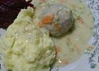3.Pulpety wyjąć z garnka.Wywar zagęścić mąką wymieszaną ze śmietaną i dwoma żółtkami.Włożyć pulpety, dodać drobno pokrojony koperek, doprawić solą i gotować na małym ogniu ok.15 min.