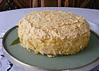 Na paterze ułożyć 1 blat, na niego część masy budyniowej, na nią cześć ubitej śmietany. Następnie kolejny blat ... itd., kończąc na bitej śmietanie. Trochę masy budyniowej zostawić do posmarowania boków tortu. Ja dodatkowo z boku przyozdobiłam płatkami migdałów. Schłodzić.