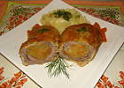 Kotlety schabowe cienko rozbić, posypać solą i pieprzem. Rozłożyć kotlet na desce, nałożyć farsz z kapusty, podwinąć boki, a następnie zwinąć jak krokiety.