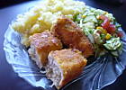 Panierować lekko najpierw w bułce, następnie w roztrzepanym jajku i jeszcze raz cienko w bułce.