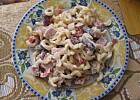 Makaron ugotować "al dente"w osolonej wodzie, przelać wodą i kiedy odcieknie, przełożyć do miski.