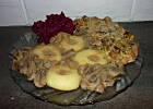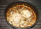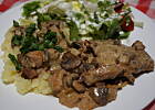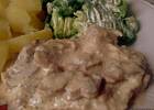 Pychota! Ja na dno naczynia żaroodpornego dałam ryż z sosem pieczarkowym, na to schabik z pieczarkami i boczkiem. Wszystko zalane śmietanką.