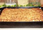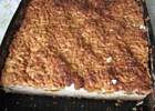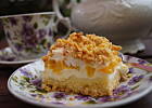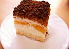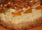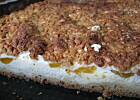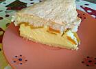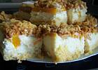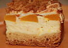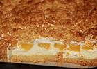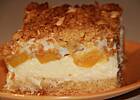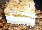 Masę serową wyłożyć na ciasto, na to odsączone, pokrojone (w plasterki) brzoskwinie. Ubić pianę z białek z pozostałą ilością cukru (1 szklanka) i wylać na wierzch. Ponoć lepszy efekt uzyska się dodając pod koniec ubijania białek jedną, płaską łyżkę mąki ziemniaczanej. Na wierzch zetrzeć (na grubych oczkach tarki) pozostałe ciasto z zamrażarki.