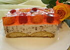 Dno tortownicy (u mnie kwadratowa 24cm x 24 cm) wyłożyć pergaminem, ułożyć biszkopty. Schłodzoną śmietanę ubić na sztywno, dodać cukier puder i serki. Żelatynę rozpuścić w wodzie, połączyć z masą serową i wyłożyć na biszkopty. Na masie rozłożyć owoce i zalać tężejącą galaretką. Schłodzić w lodówce.