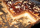 Warstwa herbatników—masa z kaszy (1 szklanka) z cukrem waniliowym—herbatniki—masa z kaszy (pół szklanki) z kakao—herbatniki—polewa z wiórkami i migdałami.