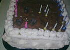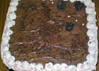 Przykryc kolejna warstwą biszkoptu i znów nasaczyc ponczem.Nastepnie rozsmarować część krenu ciemnego i "powpychać" śliwki (pokrojonr na 3-4 części) w całą powierzchnię.Przyłozyc ostatnik krążek ciasta i docisnąć równomiernie.Nasączyc resztą ponczu i wierzch posmarować resztą ciemnego kremu.Boki posmarować jasną masą i ozdaniać wg uznania.Na wierzchu posypoć wiórki żdżieranej czekolady.
