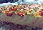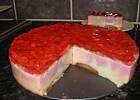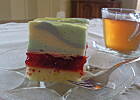Bardzo dobre ciasto. U mnie biszkopty namoczone w wodzie z sokiem malinowym, galaretka żółta, zielona i fioletowa (czerwona i niebieski barwnik). Truskawki zalane truskawkowym Tortengussem. Polecam