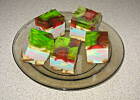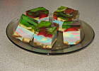 Zrobiłam na niedziele do meza na urodzinki. Biszkopty odrywały sie od dołu i pływały gdzie popadło, galaretki wszystkie zlały sie w jedno, nie było żadnej pięknej tęczy, ale i tak wszyscy byli zachwyceni!!! Myśleli, że tak ma być! Tylko ja na mysl o waszych pieknych teczach łapałam dołka i myślałam jaka to ze mnie niezdara! Co zrobiłam nie tak??? I tak będe próbowac tak długo aż sie uda!!! Wszyscy pytali jak wyczarowałam ten piekny kolor, hi, hi... Chciałam krzyknąc, pomieszajcie czerwoną, żółta i niebieska galaretke..., ale to juz tylko mój sekrecik. Smak pyszny!!!!