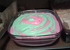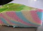 Po 1/3 masy dodać do każdej z galaretek. Dokładnie wymieszać. Wylewać na środku blaszki po 3-4 łyżki na przemian (tak jak w przypadku ciasta Zebra). Masa sama rozpłynie się na boki, tworząc kolorowe fale.