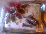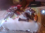 pierwsza próba z masą cukrową wg przepisu zaczepniętego ze zbiorów Dorotaxx. Ten tort jest pracą zespołową. Robiliśmy go razem z wnuczkiem. Bardzo dzielnie uczestniczył, zrobił różyczkę (tę najładniejszą i listki do bukietu, oraz hot-dog'a dla Scooby doo