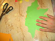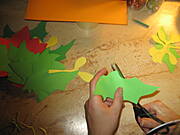 naklejamy na nie taśmę dwustronną,robimy w nim dziurkę i przyklejamy liście- dość szeroko rozkładając je