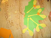 Na przyklejone liście naklejamy pręciki, a na rozwidlenia-kółeczka wycięte z innego koloru