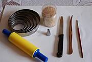 Potrzebne będzie: biała masa cukrowa w dowolnych kolorach, wałek, okrągłe wykrawaczki, mała metalowa tylka dekoratorska, wykałaczki, woda i pędzelek lub gąbeczka