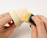 Do nanoszenia koloru używaj pędzla lub kuchennej gąbeczki. Pędzlem nanoś farbę w zwykły sposób, natomiast gąbeczką maluj, przyciskając ją raz po raz do powierzchni doniczki. Aby farba nie prześwitywała, potrzebne będą dwie lub trzy warstwy.